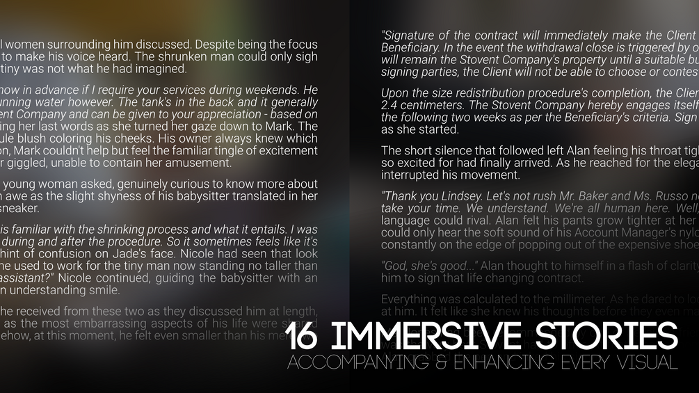 Featuring 16 beautiful visuals in glorious 4K+, each accompanied by detailed and immersive stories (over 11,000 words) and NSFW content exclusive to this version, Retrospective 2021 | Extended Edition is the ultimate way to experience my vision of size difference throughout the last 12 months. All of it wrapped up in a pretty and convenient package!